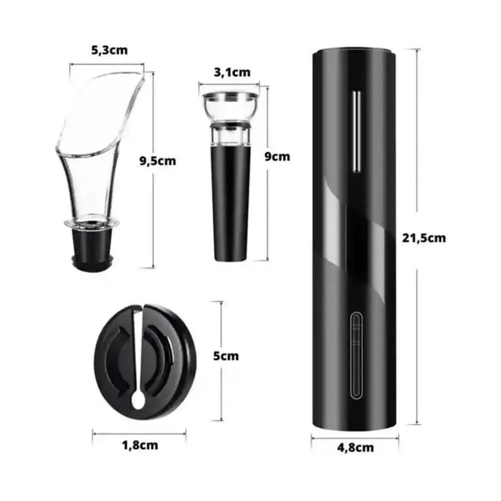 Kit Abridor de Vinhos Saca Rolhas Elétrico Automático, ideal para quem busca praticidade na hora de abrir uma garrafa de vinho. O abridor funciona de forma automática e permite abrir a garrafa em até 7 segundos, apenas pressionando um botão, sem esforço.