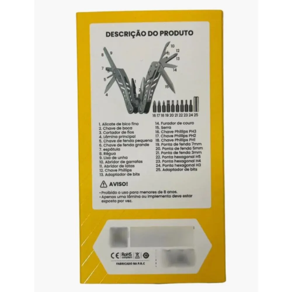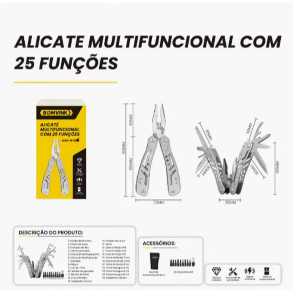 O Alicate Multifuncional Dobrável Bom-1516 é a ferramenta ideal para quem busca praticidade, versatilidade e eficiência em um único produto. Com 25 funções integradas, atende perfeitamente às necessidades de reparos rápidos, manutenções, atividades ao ar livre, camping, trilhas, pesca, sobrevivência e uso doméstico.