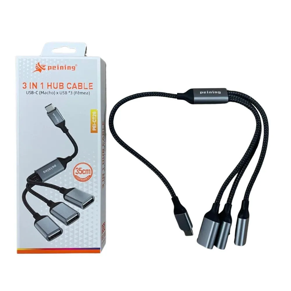 Hub de conexão desenvolvido para expandir uma porta USB-C em três portas USB, permitindo a conexão simultânea de múltiplos dispositivos compatíveis.