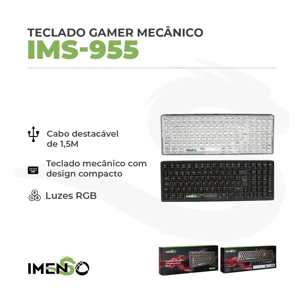 O Teclado Gamer Mecânico IMENSO IMS-955 foi desenvolvido para usuários que buscam alta performance, resistência e um design diferenciado. Seu sistema de teclas mecânicas garante resposta rápida e precisa, ideal para jogos e uso intenso.