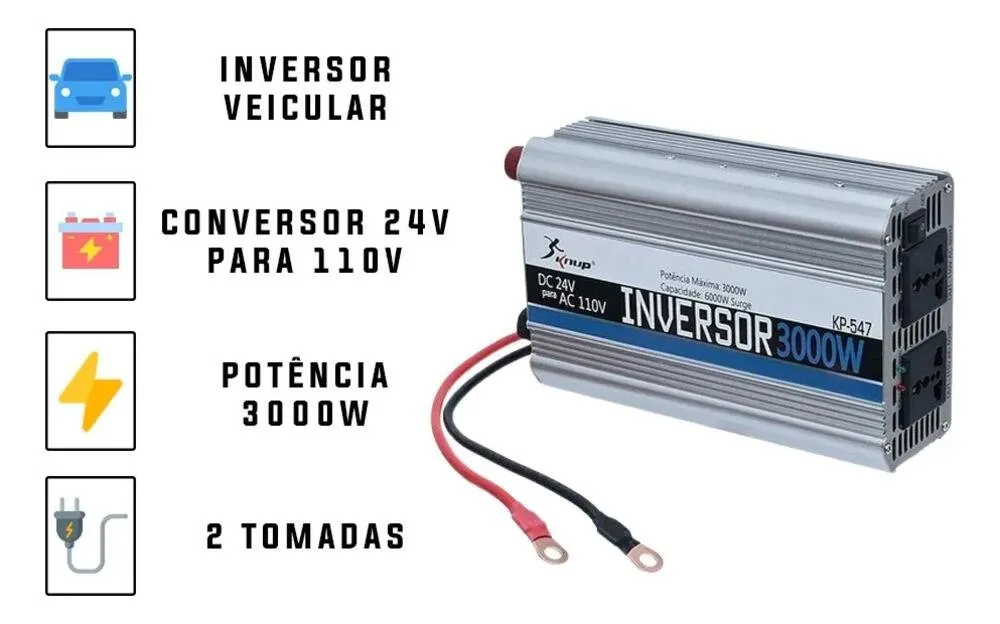 O Inversor Conversor de Tensão Veicular Knup KP-547 é desenvolvido para transformar a energia de sistemas 24V em corrente contínua em 110V em corrente alternada, permitindo a utilização de aparelhos elétricos em veículos e ambientes móveis.