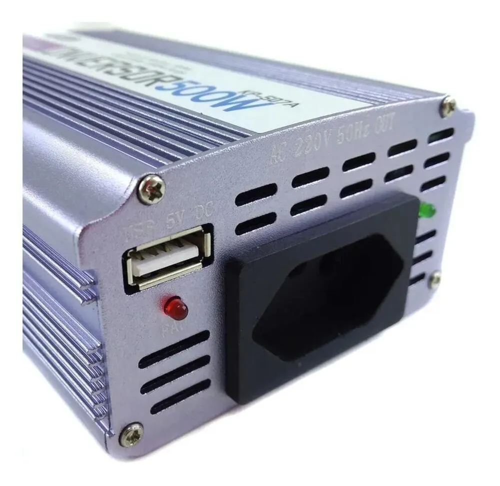 Com potência contínua de 500W e pico de até 1000W, o inversor conta com onda senoidal modificada, tecnologia de baixa interferência (T.B.I.), partida suave e sistema de refrigeração eficiente. Possui ainda saída USB 5.5V 1A, botão liga/desliga e LED indicador de funcionamento.